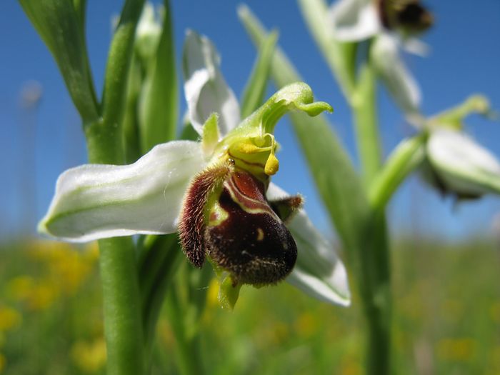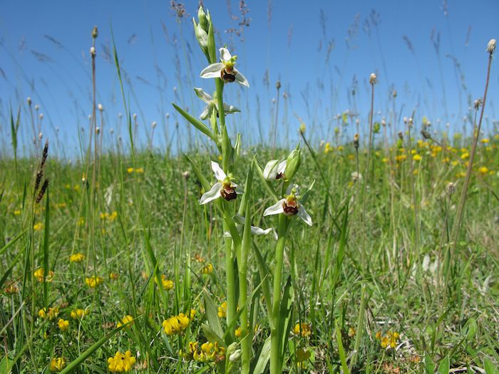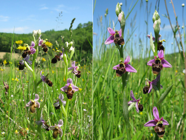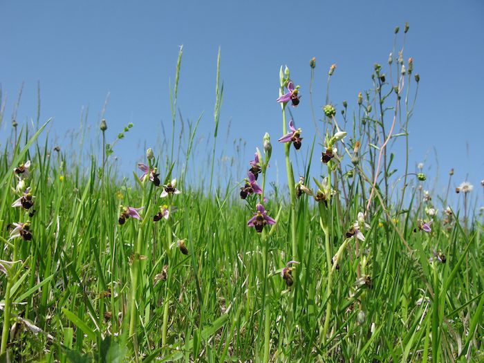 Die Orchideen-Wiesen mit zum Beispiel hier Ophrys apifera (Bienenragwurz)