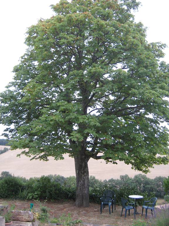 Jahrelang hatten wir das Problem, dass die schattenspendenden Rosskastanien auf unserem Gartensitzplatz wegen leidigen Schädlingen schon im August ihre Blätter vollständig verloren hatten. So sah das beispielsweise im August vor fünf Jahren aus: