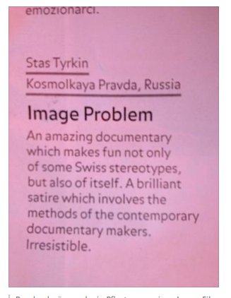Grosses Lob aus Russland: Wenn es nach der russischen Pravda gegangen wäre, dann hätte „Image Problem“ („der meistdiskutierte Film am Filmfestival von Locarno“) den goldenen Leoparden gewonnen! Die Pravda hält „Image Problem“ als den Höhepunkt des Filmfestivals von Locarno und bezeichnet die schweizerische Dokusatire als „irresistible“ (unwiderstehlich)!
