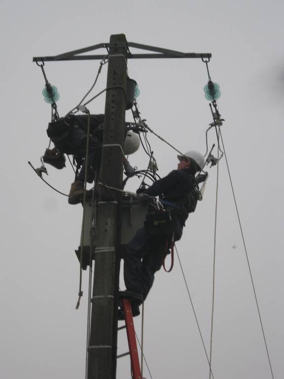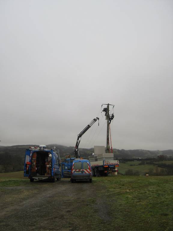 Das Stromnetz in Frankreich wird seit der Aera Sarkozy durch die private Netzgesellschaft Électricité Réseau Distribution France (ERDF) betrieben. Wie angekündigt haben heute die Monteure den 300 Kilogramm schweren Transformator oben am Ende der Freiluftleitung (poteau électric) ausgewechselt. Harte Arbeit für die Monteure!