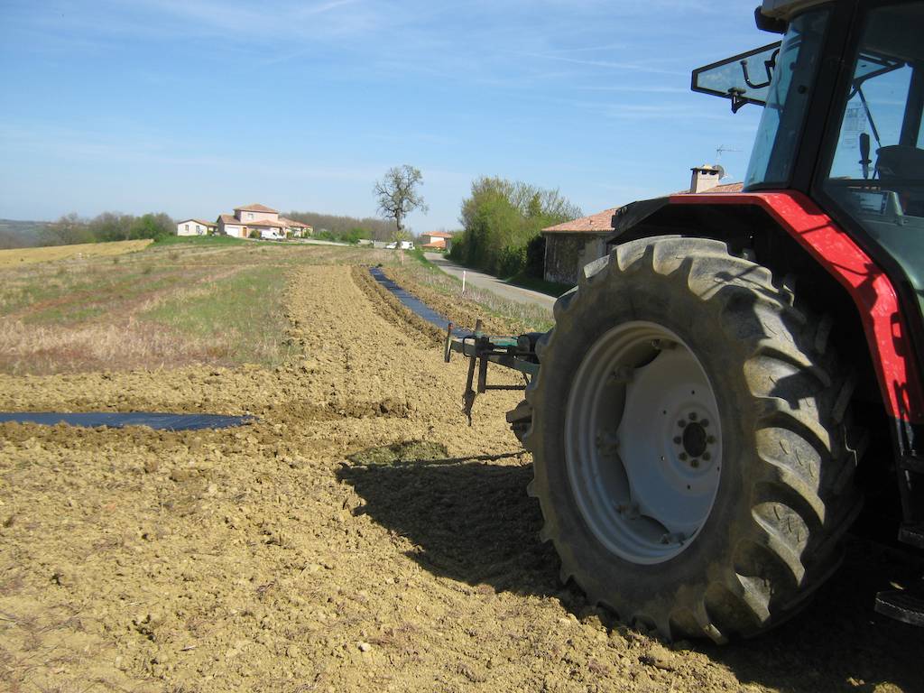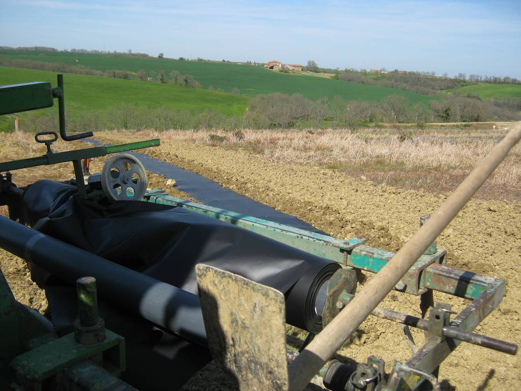 …schliesslich mit dieser einfachen Maschine, die „Arbre et Paysage“ zu Verfügung stellt, die abbaubaren Kunststofffolien (hergestellt aus Zuckerrüben) auf den Boden verlegt…