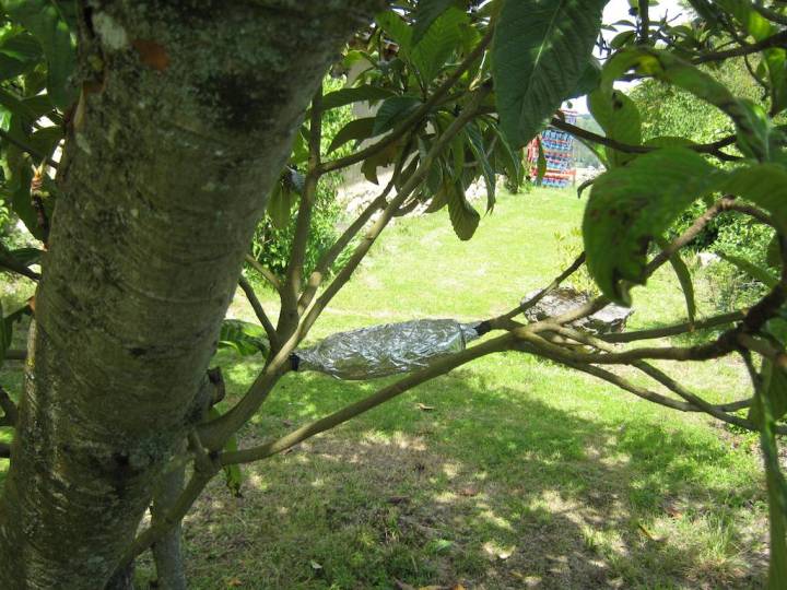 Eine aufgeschnittene Plastikflasche dient als neues „Erdreich“ wo sich die neuen Wurzeln bilden sollen. Dazu wir die Flasche fest mit feuchtem Moos (saures Milieu gegen Pilzbefall) vollgestopft. Die Flasche anschliessend gut zusammengeklebt, gegen Sonnenbrand mit Alufolie eingewickelt und schliesslich das Ganze mit einer Klarsichtfolie festgeklebt. Fertig.