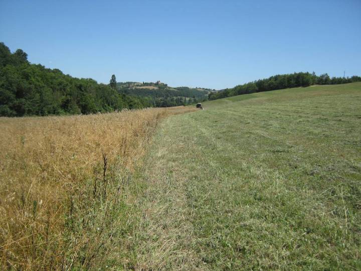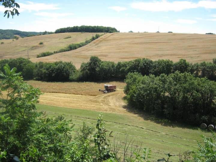 Der Mähdrescher von Jean-Michel frisst sich langsam durch die Féverole-Felder. Die Kulturen sind stark verunkrautet (Flughafer, Disteln), weil im nassen Winter/ Frühjahr die mechanische Unkrautbekämpfung praktisch unmöglich war. Die Blacken habe ich von Hand entfernt! Feuchtigkeitsmessung: 13.6% Feuchte. Ertragserwartung eher bescheiden.