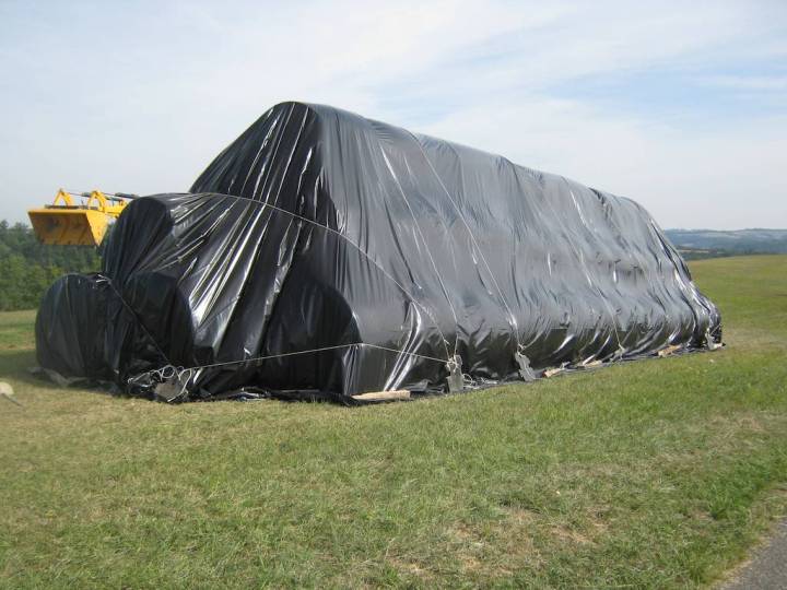 Es ist gar nicht so leicht 350 m2 Plastikfolie zu Zweit über eine Heumiete zu legen und dafür zu sorgen, dass sie nicht vom Winde verweht wird…