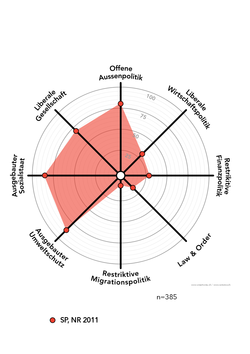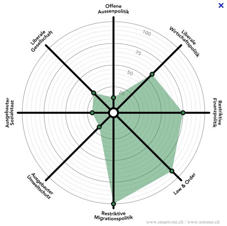 … ganz im Gegensatz zu der rechtskonservativen Schweizerischen Volkspartei (SVP), die sich vor allem mit restriktiver Ausländerpolitik profiliert.