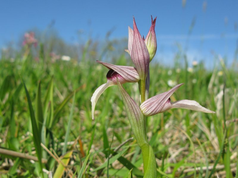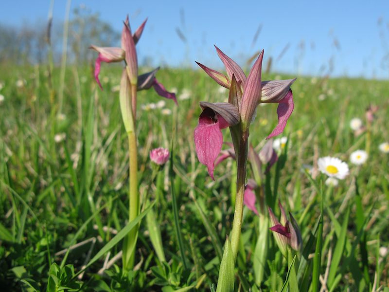 Und das gab’s hier noch nie Anfang April: die Serapias lingua (einschwieliger Zungenstendel) blühen bereits gruppenweise, zwei bis drei Wochen früher als üblich.