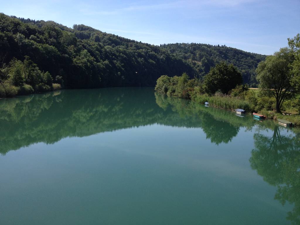 Der gestaute Niederriedsee spiegelt die Umgebung