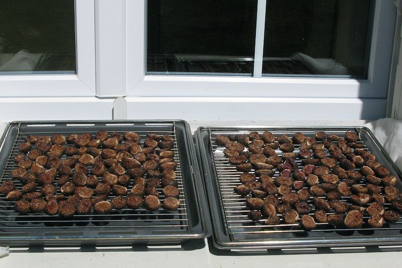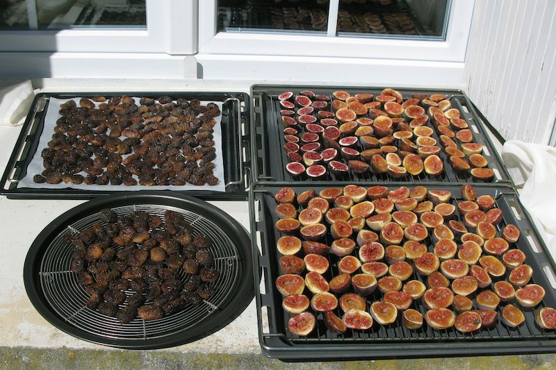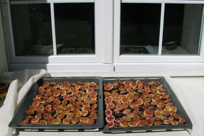 Frische Feigen pflücken, halbieren und auf ein schwarzes Ofenblech legen. Mit einem Stück Gaze (z.B. alter Vorhang) bedecken, damit die Wespen nicht dran kommen. Ofenbleche auf eine breite Fensterbank stellen. Am Vormittag vors Ostfenster und am Nachmittag vors Südfenster zügeln!