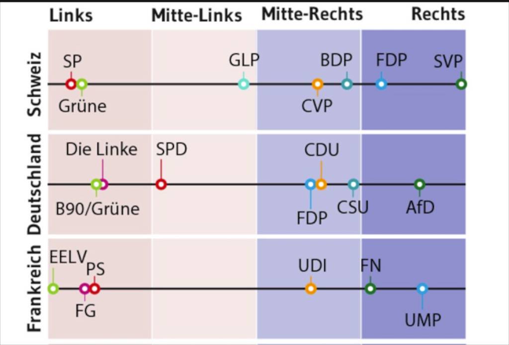 Ganz anders in der Schweiz. Die Schweizerische Volkspartei (SVP), fremdenfeindlich, nationalistisch, rechtsextrem, populistisch, finanziert und dirigiert durch Milliardäre ist inzwischen die wählerstärkste Partei der Alpenrepublik und immer noch in der Regierung vertreten. Ich höre den Einwand, die SVP sei nicht so rechtsextrem wie der Front National… Weit gefehlt: die kürzlich veröffentlichte Politologie-Studie über die Einordnung der europäischen Politparteien auf dem Links-Rechts-Schema zeigt ein ganz anderes Bild. Die SVP hat den Front National inzwischen rechts überholt!