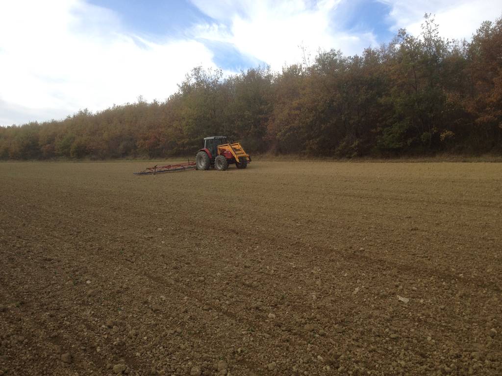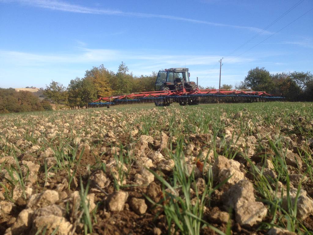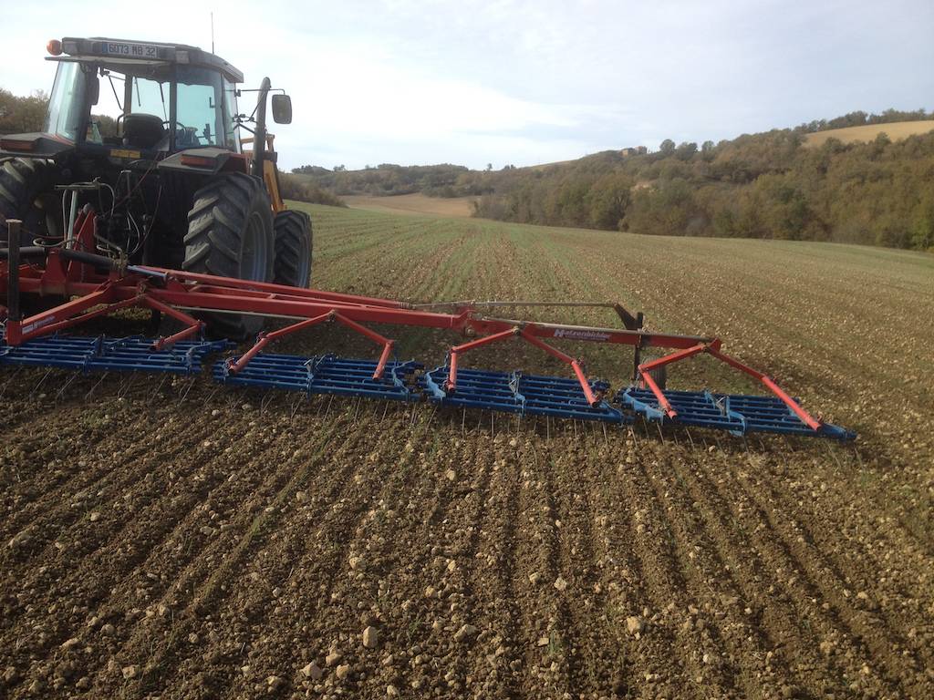 Der Hackstriegel ersetzt im Biolandbau die Chemiekeule: Nur 20 Tage nach der Saat sind die Getreidekeimlinge so weit gefestigt, dass das das Weizenfeld „trischaaget“ werden kann… Zum Striegeln sollte man den Knecht schicken, sagt man (in der Annahme, dass dieser nicht zurückschaut, ob die Kulturpflanzen geschädigt werden…?)