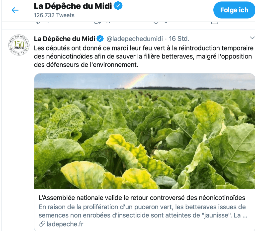 Gestern hat die französische Nationalversammlung auf Druck der gut organisierten Zuckerlobby beschlossen, wegen einer ertragsmindernden Viruskrankheit der Zuckerrüben das vor zwei Jahren verbotene Insektizid Neonicotinoid für die nächsten zwei Jahre wieder zuzulassen. Neonicotinoide töten Bienen!