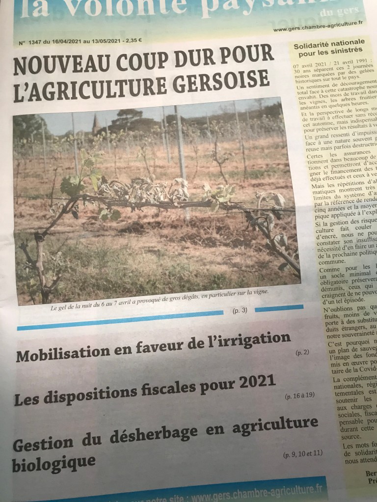 Wiederholte Nachtfröste haben schwere Schäden an den landwirtschaftlichen Kulturen in vielen französischen Regionen verursacht. Insbesondere in Rebbaugebieten sind katastrophale Ernteausfälle zu erwarten. Im Departement Tarn et Garonne sind die Früchtekulturen (Aprikosen, Pflaumen, Kirschen, Äpfel, usw.) schwer beschädigt. Die Vorsorgemassnahmen (Feuerkübel, Bewässerung) hatten wegen starken Winden nur begrenzte Wirkung oder konnten nicht angewendet werden. Frostversicherungen sind ausgesprochen teuer und die Entschädigungsleistungen basieren auf den Durchschnittserträgen der letzten sechs Jahren. Dabei waren die Erträge in dieser Zeit bereits wiederholt durch heftige Hagelschläge und Frost stark dezimiert.