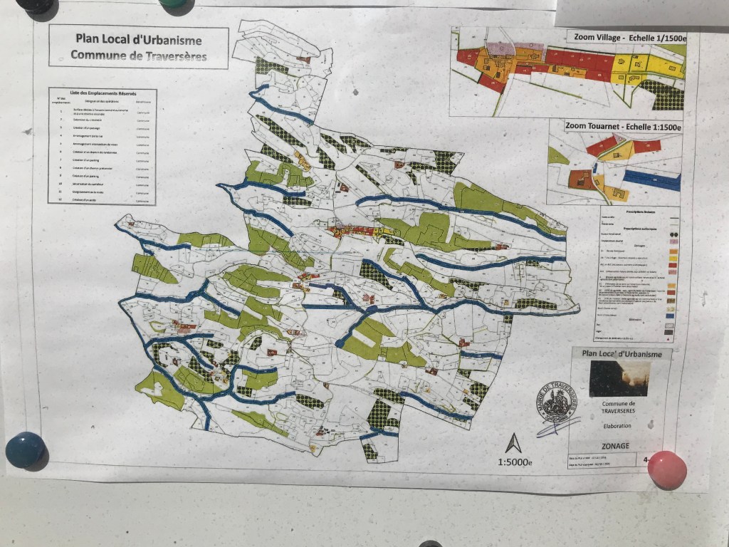Die Gemeinde Traversères zählt rund 80 Einwohner* . Der Zonenplan zeigt, dass auch in Zukunft keine grosse Bautätigkeit vorgesehen ist. Man will, dass die schöne Kulturlandschaft intakt bleibt und nicht durch einzelne, weit herum sichtbare Bauten verunstaltet wird. http://www.traverseres.fr