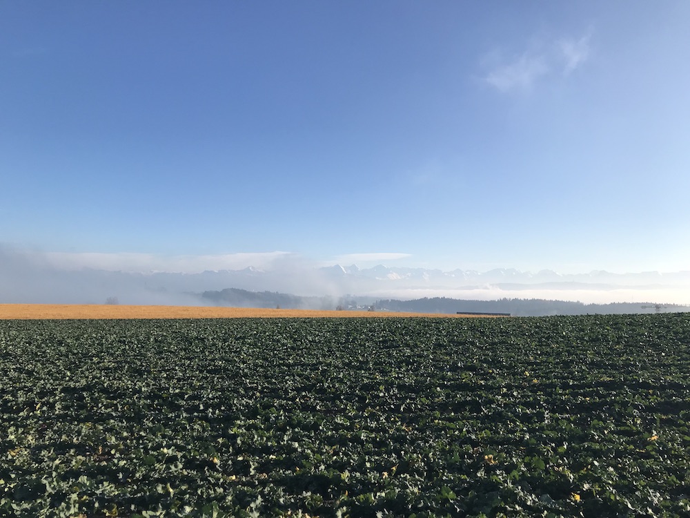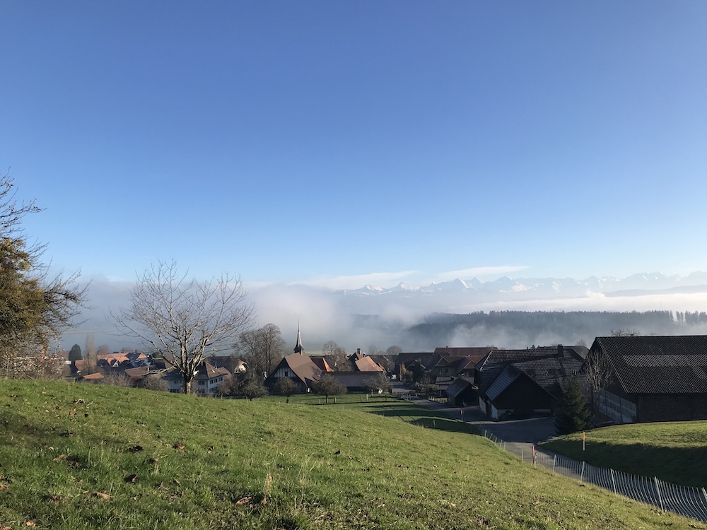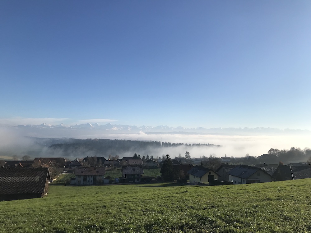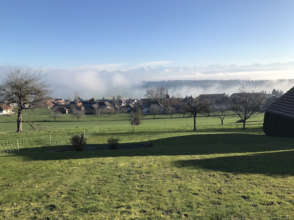 Wenn nördlich des Frienisbergcs das ganze Seeland in einen dichten Nebelschleier gehüllt ist, hat man auf der Südseite bei Meikirch dieses phantastische Panorama vor sich!