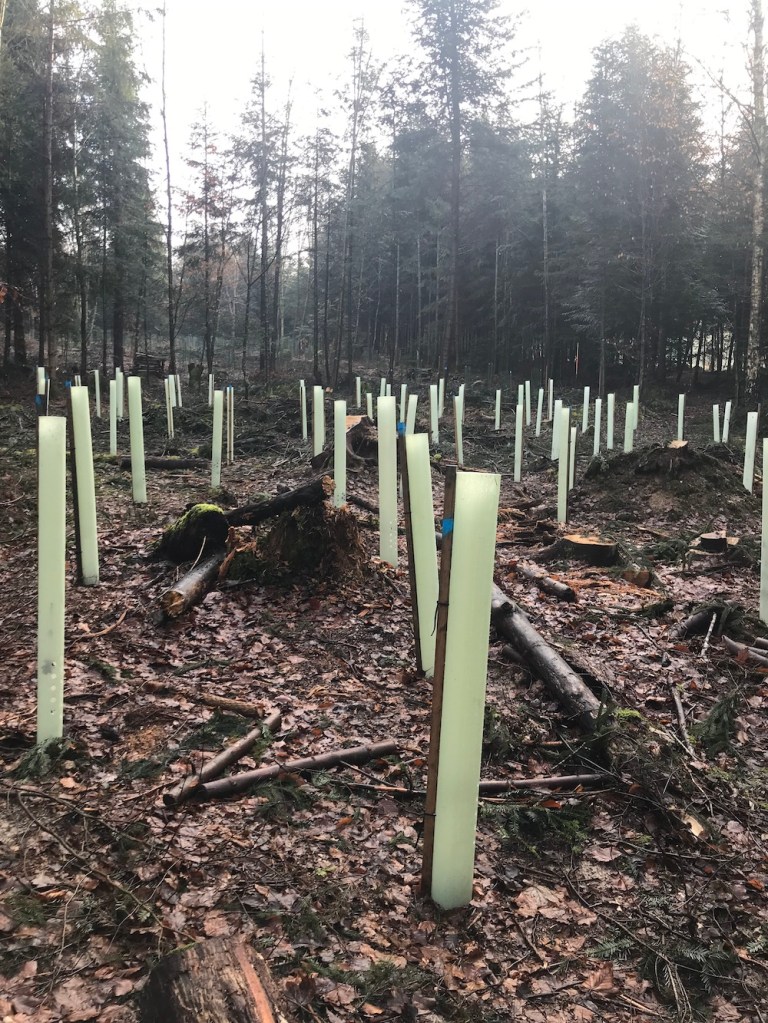 Die kleinen Setzlinge (Eichen, Buchen, Ahorne usw.) müssen durch diese Kunststoffrohre vor dem Verbiss durch Wildtiere geschützt werden, auf dass vielleicht in 200 Jahren wieder mächtige Eichen die Wälder schmücken… Generationenarbeit!