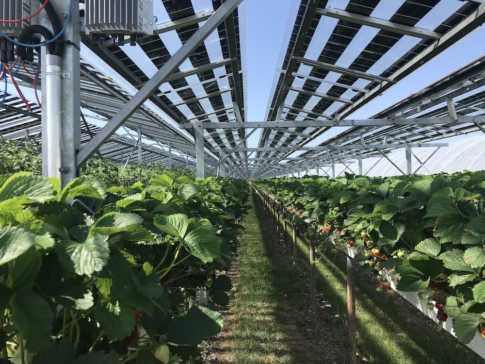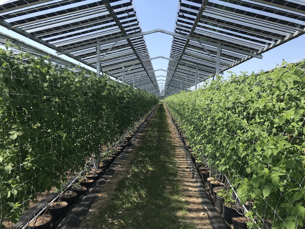 In der Gemeinde Walperswil im Berner Seeland stehen diese Solarpanel auf einem Bauernbetrieb. Die Doppelnutzung der Agrarflächen (Früchte und Elektrizität) hat meines Erachtens grosse Zukunft. Die Beeinträchtigung der Landschaft ist vergleichbar mit der sonst üblichen Einnetzung der Früchtekulturen. Zudem könne so Hagel- und Sturmschäden verhindert werden. Hier werden Erdbeeren und Himbeeren produziert.
