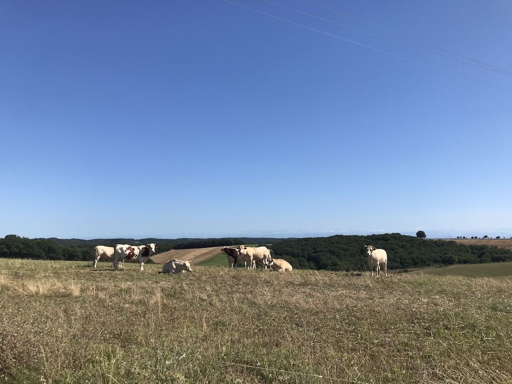 Gut angepasst an die heissen Sommer und die kargen Weiden ist die hier vorherrschende Fleischrinderrasse Blonde d’Aquitaine https://de.wikipedia.org/wiki/Blonde_d’Aquitaine
