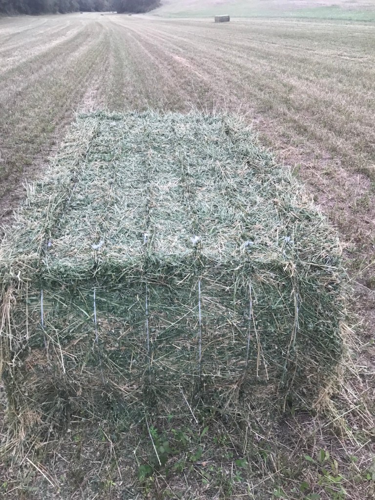 Schönes Luzerneheu (zweiter Schnitt). In der Nacht gepresst, weil es tagsüber inzwischen zu heiss ist. Die empfindlichen und proteinreichen Luzerneblätter würden zerbröseln!
