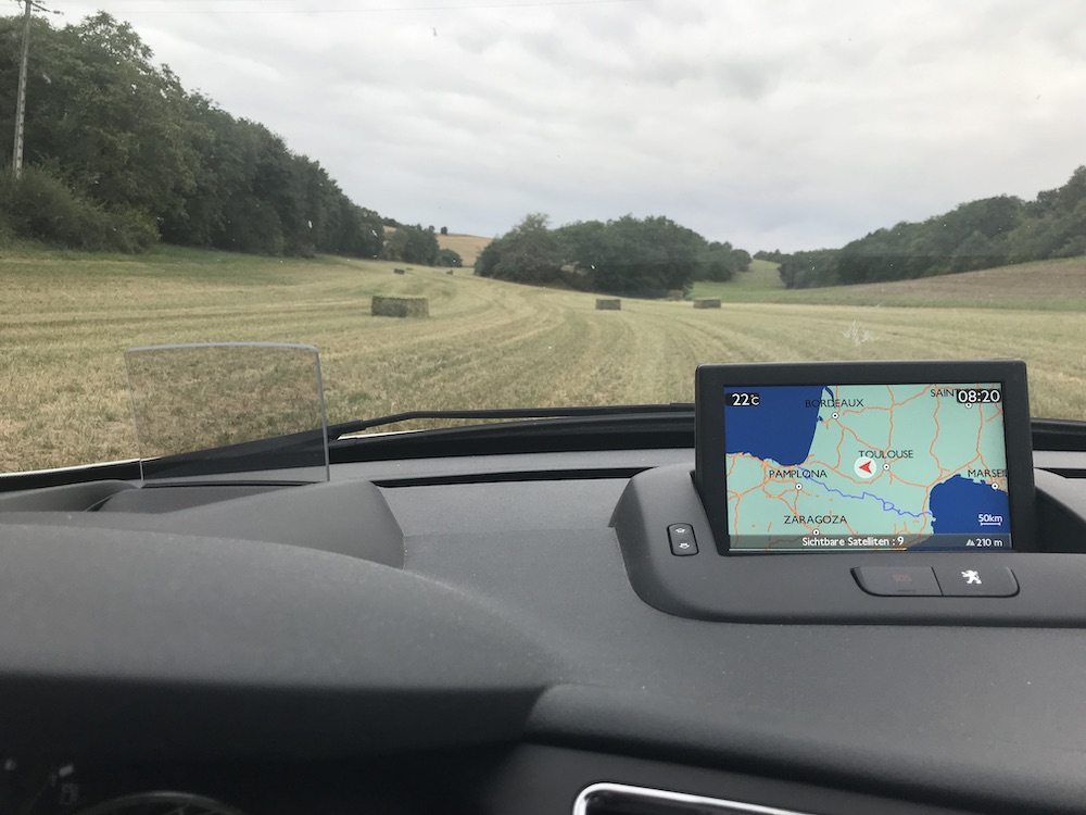 Übrigens: wie auf dem GPS-Bildschirm ersichtlich ist, bauern wir irgendwo zwischen Toulouse, Marseille, Bordeaux, Pamplona und Zaragoza….😇