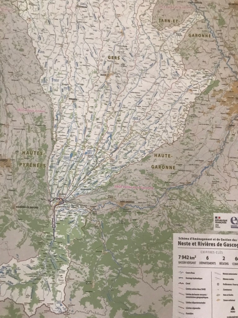 Die Wasserversorgung in der Gascogne gibt immer viel zu reden (l’avenir de l’eau en débat) und die laufende Klimaerwärmung verstärkt diese Diskussionen laufend (für die nächsten Tagen sind 38 °C angesagt!). Die sog. „chateau d’eau“ (Wassertürme) sind charakteristisch für die Landschaft und sorgen für den notwendigen Druck im Leitungsnetz. Aber auch die offenen Gewässer (Bäche und Flüsse) sind der Lebensnerv der Gegend nördlich der Pyrenäen! Verschiedene Kulturen in der Landwirtschaft gedeihen hier nur dank regelmässiger Bewässerung. Damit die Flüsse im Sommerhalbjahr nicht austrocknen, wird das Schneewasser aus den Pyrenäen gestaut, Elektrizität gewonnen und anschliessen in einem ausgeklügelten Kanalsystem dosiert in die Flüsse des Gers eingeleitet. Das Kanalsystem Neste versorgt so fast 8000 km2 in 660 Gemeinden. Komplettiert wird das hiesige Wasserversogungssystem durch 3000 kleine Seen von Landwirten (plans d’eau collinaire) die sich bei kräftigen Regenfällen auffüllen. Das System Neste wurde in seinen Grundzügen schon ab dem Jahr 1848 konzipiert, gebaut und immer wieder erweitert und angepasst. Auch der Hochwasserschutz spielt dabei eine grosse Rolle.