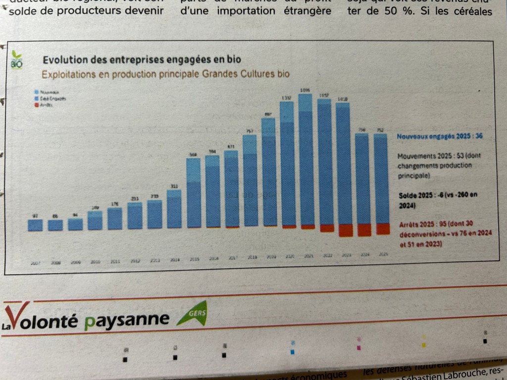 Wir sind nun seit mehr als 25 Jahren in Frankreich. Unseren 70 Hektaren Betrieb bewirtschaften wir seit anbeginn biologisch. In unserem Departement Gers hat während 20 Jahren der Biolandbau laufend zugenommen. Seit 2022 ist aber leider eine markante Trendumkehr festzustellen: der Biolandbau ist frankreichweit in der Krise!