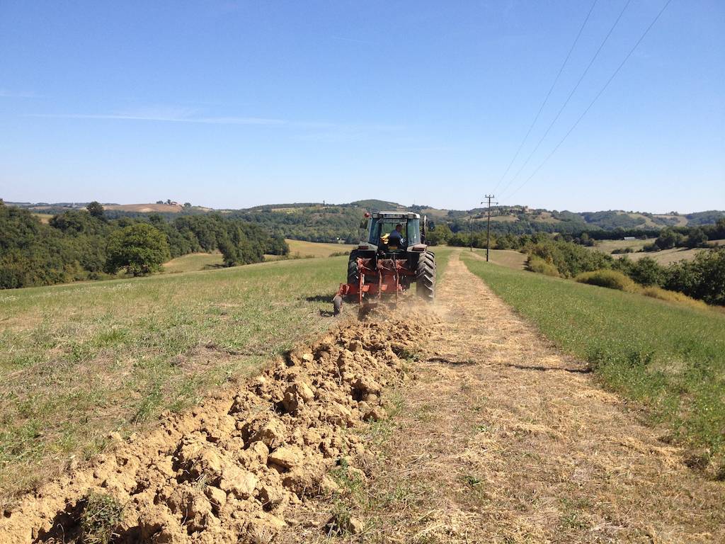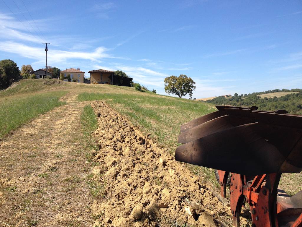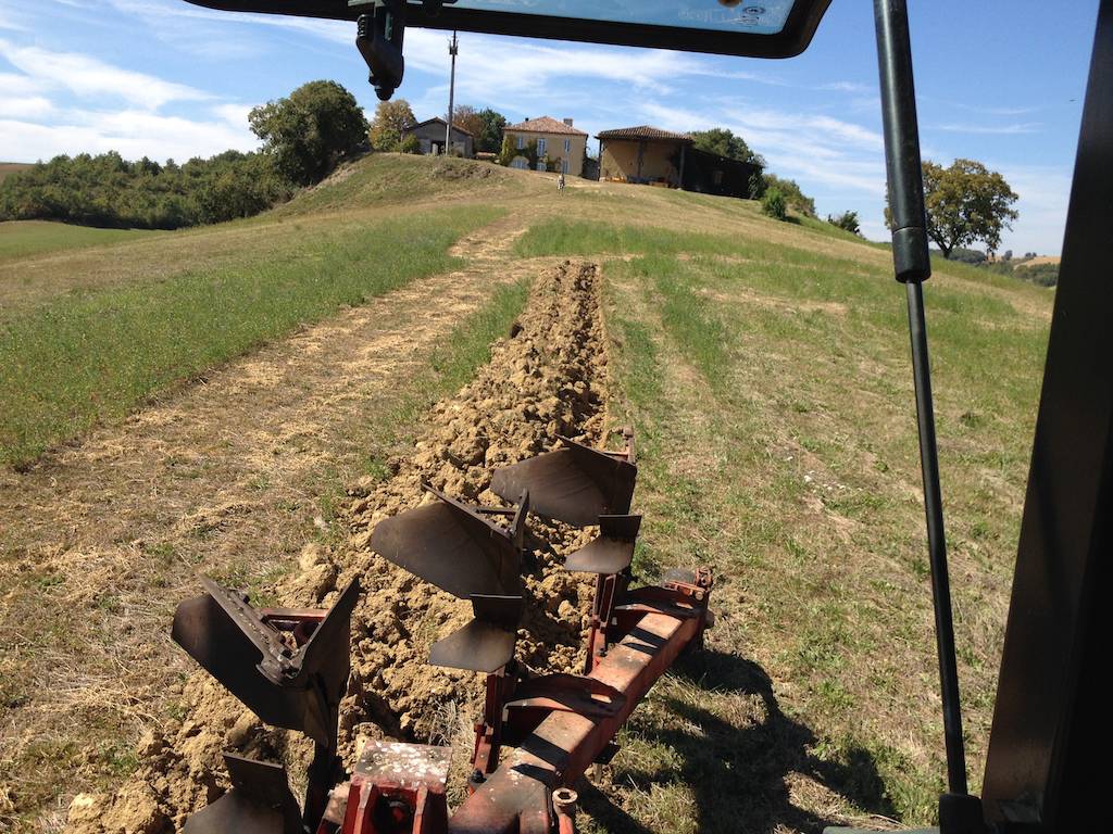 Weil ich das Luzerne-Bio-Heu nicht verkaufen kann, muss ich wieder vermehrt auf Getreidebau setzen (Frankreich muss als grosser Getreideexporteur immer noch Bio-Getreide importieren). Mit der ersten Ackerfurche auf dem Luzernefeld soll ein neues Biogetreidefeld angelegt werden. Der Boden ist hart, steinig und manchmal macht mir auch der felsiger Untergrund zu schaffen. Traktorführer, Traktor und Dreischarpflug sind gefordert.