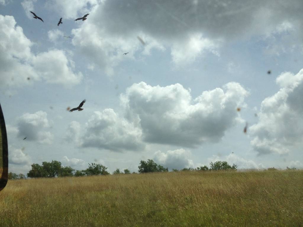 Ich bin am Oekoheu mähen. Alle Orchideen sind verblüht. Die Mähmaschine scheucht Flugheuschrecken und andere Insekten auf, was dutzendweise Raubvögel anlockt.