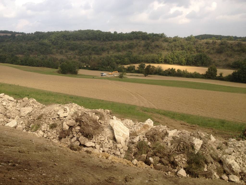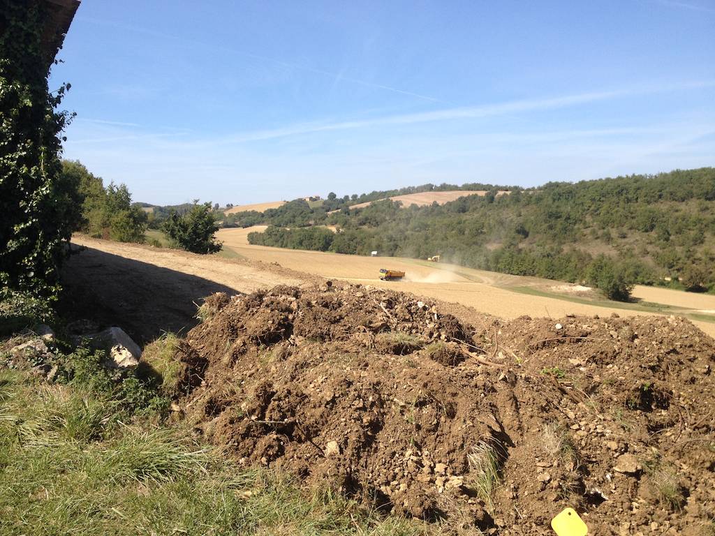 Nach vier Tagen intensiver Arbeit ist die Aufschüttung fast fertig. Denis Huchon http://www.huchon-terrassement.com/index.html und sein Team haben von morgen früh bis abends spät ganze Arbeit geleistet: Unzählige Lastwagenfuhren, Abbau von Erde, Kies und Fels, Transport vom Feld zum Hof, Stabilisierung der Aufschüttung… Die bestehende Maschinenhalle wird künftig viel rationeller genutzt werden können.
